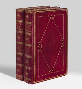 2 volumes petit in-8 (180 x 114 mm), maroquin rouge à long grain, double filet gras et maigre en encadrement, décor de type losange-rectangle dessiné au filet doré sur les plats, dos lisse orné, filet sur les coupes, dentelle intérieure et fine roulette dorée sur la doublure, doublures et gardes de moire bleu ciel, tranches dorées ([Bozerian]).