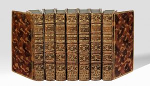 7 volumes in-8 (196 x 122 mm), veau porphyre, triple filet doré, tranches marbrées (Langlois, rel. à Lyon). Première édition collective, publiée par Rigoley de Juvigny.