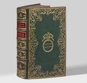 In-12 (170 x 95 mm), maroquin vert, large dentelle dorée, fer à l'oiseau aux angles, supralibris de Madame Dantigny dans un médaillon ovale au centre, dos orné, pièces de titre et de partie rouges, gardes de papier rose, tranches dorées sur marbrure rouge légère (Derome le jeune).