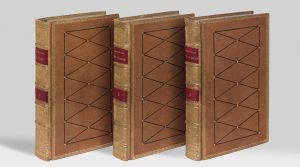 3 volumes in-8 (200 x 114 mm), veau fauve, fine dentelle dorée, décor de fleurettes dorées reliées par des filets noirs formant losanges sur les plats, dos orné, filet torsadé sur les coupes, dentelle intérieure dorée, tranches dorées (Larrivière).
