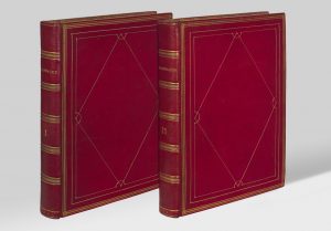 2 volumes grand in-4 (348 x 267 mm), maroquin rouge cerise à long grain, triple filet doré avec fleurettes d'angles, décor de type losange-rectangle tracé au filet doré sur les plats, dos à faux-nerfs mosaïqués de listels de maroquin vert, coupes ornées, dentelle intérieure dorée, doublures et gardes de moire bleu ciel, tranches dorées (Bozerian).