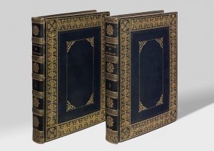 2 volumes in-4 (300 x 225 mm), maroquin bleu à long grain, large bordure de fers dorés à fond criblé, roulette à froid, encadrement central de filets pointillés avec fleurons d'angles, dos orné, coupes guillochées, large encadrement sur la bordure intérieure, doublures et gardes de papier ocre, tranches dorées (Lesné).
