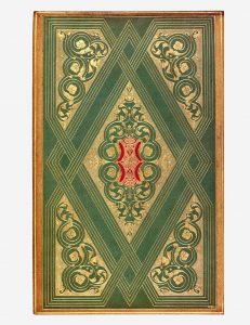 Grand in-8 (270 x 170 mm), maroquin citron, double encadrement de filets à froid, dos orné de même, doublures de maroquin vert mosaïqué ornées d'un grand décor avec un losange central à fond criblé et rinceaux mosaïqué de maroquin rouge au centre, larges écoinçons à fond criblé et rinceaux, chaque élément délimité par un jeu de filets entrecroisés, gardes de moire verte, tête dorée, couverture (Debès).
