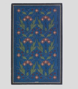 In-8 (218 x 135 mm), maroquin bleu foncé janséniste, doublures de maroquin turquoise ornées d'un riche décor mosaïqué de fleurs, feuilles et fruits de maroquin vert, grenat et rose, serti de filets à froid, gardes de faille dorée, doubles gardes, tranches dorées sur marbrure, couverture et dos, chemise et étui gainés de maroquin noir, emboîtage de toile moderne (Marius Michel).