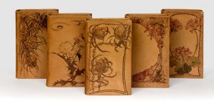 5 volumes in-16 (156 x 90 mm), veau beige, décor floral et sylvestre pyrogravé et rehaussé à l'aquarelle et à l'or, différent sur les deux plats de chacun des volumes, dos lisse muet, tête dorée, étui collectif bordé, emboîtage en toile moderne (P. Provost, Reims).