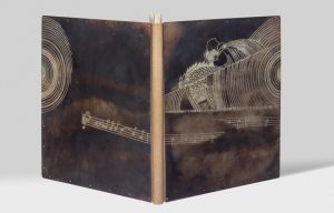 In-4 (295 x 232 mm), reliure à plats rapportés formés de deux plaques de cuivre ornées d'un décor gravé puis laqué inspiré de l'ouvrage, dos lisse en maroquin beige, décor de chevrons sur le retour intérieur de la plaque de cuivre, doublures et gardes de tabis gris, tranches dorées sur témoins, couverture et dos, chemise et étui, boîte de toile moderne (Jean Dunand – René Kieffer).