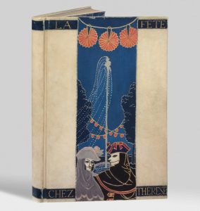 Paris, Au Ménestrel, Heugel & Cie, 1910. In-4 (285 x 195 mm), bradel vélin ivoire, décor peint comprenant une scène de carnaval vénitien animée de deux personnages masqués dans une large bande verticale traversant le premier plat et deux bandes horizontales contenant le titre de l'ouvrage en haut et en bas du plat, large bande verticale bleue sur le second plat, dos lisse, doublures et gardes de papier bleu au décor argenté, tête argentée, non rogné, couverture et dos, emboîtage de toile moderne (Wils).