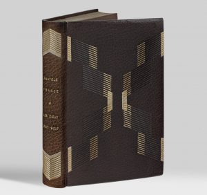 In-12 (185 x 115 mm), maroquin brun, décor géométrique de filets obliques juxtaposés à froid et dorés traversant quatre petites bandes verticales de maroquin crème mosaïquées, dos lisse orné de même, filets intérieurs à froid et dorés, doublures et gardes de tabis brun, doubles gardes, couverture et dos, tranches dorées, emboîtage de toile moderne (Pierre Legrain – J. Anthoine Legrain).