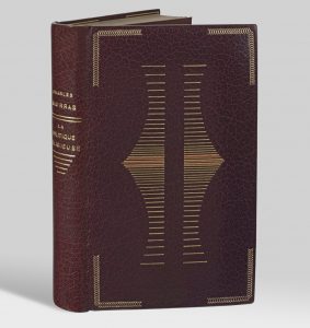 In-12 (182 x 115 mm), maroquin prune, décor géométrique composé d'une double rangée de filets dorés et de six listels de maroquin rouge mosaïqués, frise de petits arceaux dorés aux angles, dos lisse, filet intérieur doré, doublures et gardes de daim prune, tranches dorées sur témoins, couverture et dos, emboîtage de toile moderne (M. Gras).