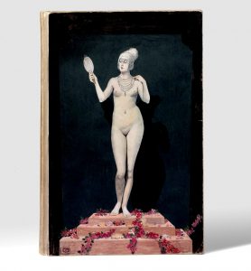In-8 (207 x 136 mm), bradel vélin ivoire, peinture originale signée de Leonnec exécutée sur l'intégralité du premier plat représentant une femme nue se regardant dans un miroir, debout sur une estrade couverte de fleurs, dos lisse muet, tranches lisses, couverture, emboîtage de toile moderne (Reliure de l'époque).