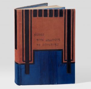 Grand in-8 (297 x 217 mm), veau bleu dans la partie inférieure de la reliure et daim roux dans la partie supérieure, décor de listels de veau noir mosaïqué, titre de l'ouvrage estampé sur le plat supérieur, dos lisse, gardes de soie bleue brochée d'argent, tête dorée, non rogné, couverture, emboîtage de toile moderne (Jeanne Bézier).