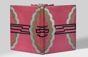 In-8 (248 x 177 mm), maroquin rose, grand feston mosaïqué de maroquin havane et de veau argenté partant du dos pour finir sur chaque plat, une moitié du feston y étant répétée en vis-à-vis, jeu de listels horizontaux mosaïqués en maroquin noir sur les plats, contenant le titre et le nom de l'auteur au palladium sur le premier plat, dos lisse, encadrement intérieur de maroquin rose orné d'un cœur en veau argenté mosaïqué à chaque angle, doublures et gardes de tabis fuschia, doubles gardes de papier argenté, tête argentée, non rogné, couverture et dos, emboîtage de toile moderne (Marot-Rodde).