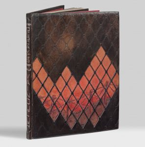 In-4 (282 x 225 mm), basane brune, plats ornés de croisillons à froid, dont une partie a été ajourée sur le premier plat pour laisser apparaître un décor incisé et peint de fils barbelés sur fond de ciel rouge orangé, dos lisse titré au palladium, doublures et gardes de daim rouge, doubles gardes, tête argentée, non rogné, couverture, étui bordé en canevas de paille, emboîtage de toile moderne (Anita Conti, 1938).