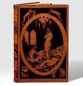 In-8 (250 x 160 mm), basane fauve, important décor entièrement estampé à froid sur les plats représentant une scène de sérail dans un grand ovale central et des singes dans les angles, signé J. H. [Joe Hamman], dos lisse orné de même, tête dorée, non rogné, couverture, emboîtage de toile moderne (René Kieffer).