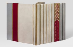 In-8 (204 x 146 mm), veau blanc, rouge et argenté divisé en bandes verticales séparées de listels de veau doré ou noir, titre doré à la verticale et décor de listels obliques blancs, rouges et dorés sur les deux bandes rouges centrales, dos lisse muet, encadrement intérieur de veau argenté et doré, doublures et gardes de soie blanche brochée d'argent, couverture et dos, tête dorée, non rogné, emboîtage en toile moderne (Jeanne Bézier).