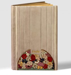 In-12 (180 x 120 mm), veau gris clair, listels verticaux de veau blanc sur le premier plat, arc de cercle en pied comprenant un riche décor floral mosaïqué en veau multicolore, dos lisse muet, listel de papier doré en encadrement intérieur, doublures et gardes de soie coquille, tête dorée, non rogné, couverture et dos, emboîtage de toile moderne (Jeanne BÉZIER).