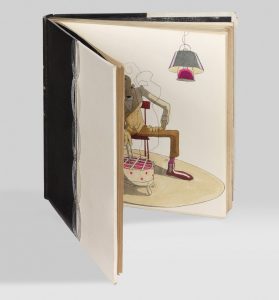 Petit in-4 carré (187 x 190 mm), maroquin noir et veau blanc à mi-partie sur les deux plats, décor torsadé au milieu des plats composé de filets dorés, argentés, noirs et blancs, dos lisse, gardes de papier décoré, tête dorée, non rogné, couverture et dos, étui assorti (Creuzevault).