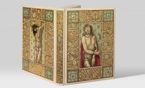 In-4 (265 x 197 mm), bradel vélin ivoire entièrement peint par Louis Jou, chaque plat orné d'une large bordure florale à fond doré contenant les lettres du titre en réserve et d'une grande aquarelle gouachée et vernie au centre, représentant la Passion sur le premier plat et la Crucifixion sur le second, dos lisse orné d'une même bordure florale à fond doré avec le titre en réserve, doublures et gardes de japon blanc, non rogné, couverture et dos, emboîtage de toile moderne (L[ouis] J[ou] – G. Mercier sr. de son père, 1931).