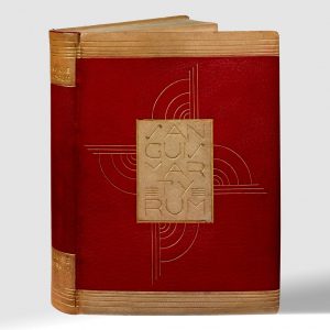Grand in-8 (248 x 185 mm), maroquin rouge, bandes horizontales de maroquin beige mosaïqué et ornées de filets dorés en tête et en pied des plats se prolongeant sur le dos, composition géométrique au filet doré sur le premier plat encadrant une pièce de titre de maroquin beige mosaïqué, dos lisse, bordure intérieure en maroquin rouge et beige mosaïqué orné de filets dorés, doublures et gardes en papier blanc, non rogné, couverture et dos, emboîtage de toile moderne (S. Vaschalde, H. Dumas, 1929).