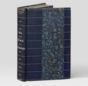 In-12 (185 x 115 mm), demi-maroquin bleu à bandes décoré de lignes horizontales de pointillés dorés, dos lisse orné de même, titré à l'or et au palladium, tête dorée, non rogné, couverture et dos, emboîtage de toile moderne (Paul Bonet). Édition originale de l’une des innombrables « œuvres à quatre mains » écrites par les frères Tharaud.