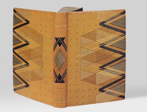 In-12 (190 x 126 mm), maroquin citron, composition géométrique de triangles et listels de maroquin noir mosaïqués, filets obliques dorés et à froid et petits cercles à froid, dos lisse orné de même, bordures intérieures de même maroquin ornées de petits cercles dorés, doublures et gardes de tabis vert, doubles gardes, tranches dorées sur témoins, couverture et dos, emboîtage de toile moderne (Pierre Legrain, J. Anthoine Legrain).
