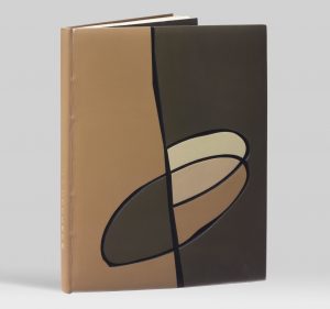 In-8 (234 x 188 mm), box beige, plat supérieur pour moitié en box beige, pour moitié en box olive, composition centrale mosaïquée en relief en box beige, sable, amande et olive sur fond de box noir, dos lisse titré à la verticale, doublures et gardes en box olive, couverture et dos, non rogné, chemise et étui gainés de box olive (Leroux, 1976).