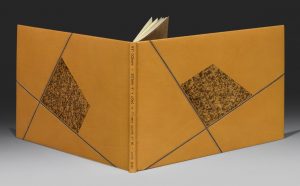 In-8 oblong (227 x 167 mm), box ocre, décor géométrique composé de deux filets bruns obliques, poussés à la roulette striée sur deux listels de maroquin beige mosaïqué, s'entrecroisant au milieu des plats, trapèze irrégulier de basane marbrée mosaïqué dans un angle de leur intersection, dos lisse titré en long, doublure et gardes de daim marron, couverture et dos, non rogné, chemise et étui assortis (Leroux, 1989).