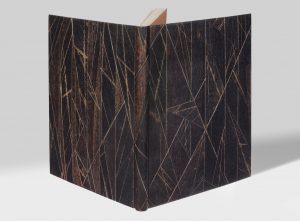 In-8 (235 x 175 mm), bradel cartonnage orné d'une composition de papier réalisée à partir de kraft d'emballage goudronné, cloisonné de fils collés, couverture et dos, chemise à sangle assortie, emboîtage de toile moderne (F. Rousseau, 1984).