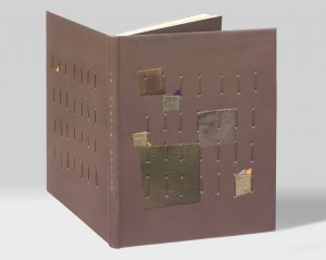 In-12 (170 x 130 mm), box grège, plats percés de huit rangées de sept trous par lesquels passe une ficelle poissée, carrés de buffle et box de tailles et teintes variables mosaïqués sur le plat supérieur, petits triangles de cuir mauve, violet et jaunes mosaïqués sur les deux plats, dos lisse titré à la verticale, doublures de même box laissant apparaître les passages de la ficelle et comportant chacune deux petits triangles mosaïqués jaune et violet, gardes de même box, couverture et dos, non rogné, chemise et étui (mm [Monique Mathieu]).