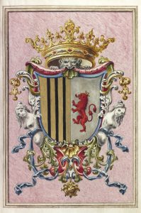 Ces peintures sont suivies de 8 pp. de texte manuscrit, contenues dans de beaux encadrements en grisaille et doré agrémentées de deux lettrines historiées finement dessinées à l'encre noire, confirmant le droit héréditaire du lieutenant général Don Jorge Negreyros y Silba au titre de marquis de Negreiros.