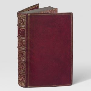 In-8, maroquin rouge, triple filet doré, dos orné, roulette sur les coupes, doublures de maroquin rouge ornées d'une dentelle dorée en encadrement, tranches dorées sur marbrure (Reliure de l'époque).
