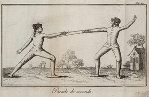 Seconde édition de ce traité d'escrime, illustrée de quatorze planches dépliantes gravées sur cuivre.
