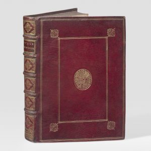 In-4, maroquin rouge, décor à la Du Seuil, armoiries dorées au centre, dos orné, roulette sur les coupes, dentelle intérieure dorée, tranches dorées (Reliure de l'époque).