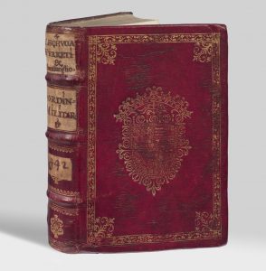 3 ouvrages en un volume petit in-4, maroquin rouge, roulette dorée et grands fleurons d'angles, armoiries et emblème dorés au centre des plats, dos orné, pièces manuscrites sur papier, tranches dorées (Reliure vers 1640).