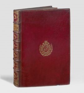 2 parties en un volume in-folio, maroquin rouge, triple filet doré, armoiries au centre, dos orné de fleurs de lis et dauphins couronnés alternés, filets sur les coupes, dentelle intérieure dorée, tranches dorées sur marbrure (Reliure de l'époque).
