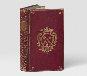 2 parties en un volume in-12, maroquin rouge, triple filet doré, fleurettes aux angles, armoiries au centre, dos lisse orné, filet sur les coupes, dentelle intérieure, tranches dorées (Reliure de l'époque).