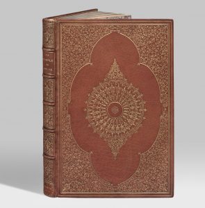 Grand in-8, maroquin orangé, triple filet doré, plats semés d’arabesques aux fers pointillés, compartiment quadrilobé en réserve au centre, grand médaillon central, dos orné de fers pointillés, doublures en maroquin bleu encadrées d'une dentelle dorée, tranches dorées (De Samblancx-Weckesser).
