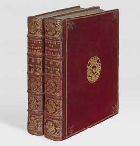 2 volumes in-4, maroquin rouge, triple filet doré, fleurons filigranés aux écoinçons, armoiries au centre, dos orné des mêmes armoiries répétées, roulette sur les coupes, dentelle intérieure dorée, tranches dorées sur marbrure (Reliure de l'époque).