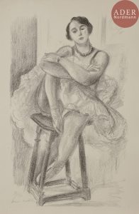 Henri MATISSE - Danseuse assise au tabouret, genou relevé et bras croisés. Pl. de l’album Dix Danseuses. 1927. Lithographie. 457 x 278. Duthuit-Garnaud 481. Très belle épreuve sur vélin blanc, numérotée et signée au crayon. Quelques...