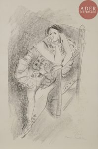 Henri MATISSE - Danseuse assise au fauteuil, accoudée, main à la bouche. Pl. de l’album Dix Danseuses. 1927. Lithographie. 460 x 260. Duthuit-Garnaud 483. Très belle épreuve sur vélin blanc, numérotée et signée au crayon. Nombreuses...