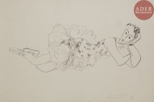 Henri MATISSE - Danseuse allongée, la main reposant sur la tête. Pl. de l’album Dix Danseuses. 1927. Lithographie. 157 x 415. Duthuit-Garnaud 486. Très belle épreuve sur vélin blanc, l’une des 10 annotées « epreuve d’artiste »,...