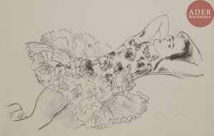 Henri MATISSE - Danseuse alanguie, les mains sous la tête. Pl. de l’album Dix Danseuses. 1927. Lithographie. 273 x 457. Duthuit-Garnaud 487. Très belle épreuve sur vélin blanc, numérotée et signée au crayon. Fine bande d’oxydation au...