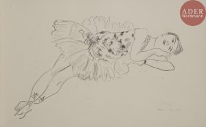 Henri MATISSE - Danseuse alanguie, bras repliés, une main à la joue. Pl. de l’album Dix Danseuses. 1927. Lithographie. 253 x 415. Duthuit-Garnaud 488. Très belle épreuve sur vélin blanc, numérotée et signée au crayon. Rousseurs claires...