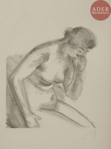 André DERAIN - Nu assis, penché vers la droite, une main sur la cuisse, l’autre vers la bouche. Vers 1927. Lithographie. 240 x 216. Adhémar 68. Très belle épreuve sur vélin blanc fort, signée au crayon. Toutes marges.