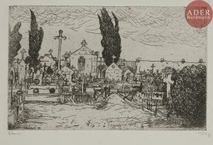 Jean-Émile LABOUREUR - Cimetière (La Bouteillerie, Nantes). 1899. Eau-forte. 117 x 185. Laboureur 24. Parfaite épreuve sur vélin blanc, signée et numérotée au crayon. Toutes marges. Rare. Tirage à 16 épreuves (sur les 25 annoncées).