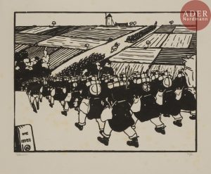 Jean-Émile LABOUREUR - Le Régiment en marche. 1900. Bois gravé. 229 x 299. Laboureur 606. Très belle épreuve sur japon, signée et numérotée au crayon. Rousseurs claires éparses. Toutes marges. Tirage total à 20 épreuves (malgré les 60...