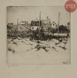 Jean-Émile LABOUREUR - Les Maisons dans les dunes. 1906. Eau-forte. 119 x 132. Laboureur 65. Très belle épreuve sur vergé ancien, signée au crayon. Quelques rousseurs et menues salissures. Petites traces de colle dans les angles au verso....