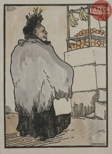 Jean-Émile LABOUREUR - Marchande d’oranges. 1909. Bois gravé. 230 x 165. Laboureur 644. Très belle épreuve sur chine volant, largement coloriée à l’aquarelle, avec traits de crayon rouge. Quelques rousseurs claires. Fins plis de tirage...