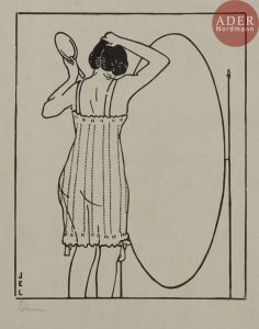 Jean-Émile LABOUREUR - Le Miroir ovale. 1911. Bois gravé. 142 x 113. Laboureur 656. Très belle épreuve sur japon mince, signée au crayon et annotée en pied « épreuve d’essai ». Toutes marges. Tirage à 21 épreuves (sur les 25...