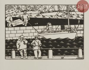 Jean-Émile LABOUREUR - La Rentrée au port. (Pl. 3 des Quatre images bretonnes). 1913. Bois gravé. 248 x 360. Laboureur 698. Très belle épreuve sur japon, non signée comme à l’ordinaire. Quelques rousseurs claires. Fine bande...